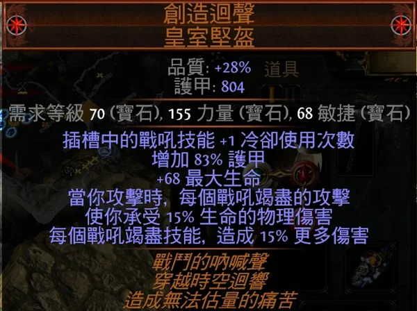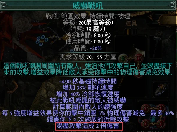 回音头,攻击技能根据受影响的战吼数量造成更多伤害。我用了两个增助战吼,所以能拿到30%more的提升。