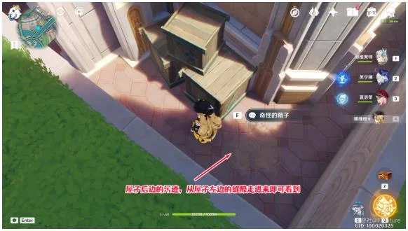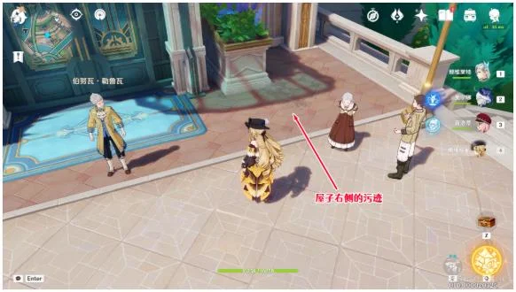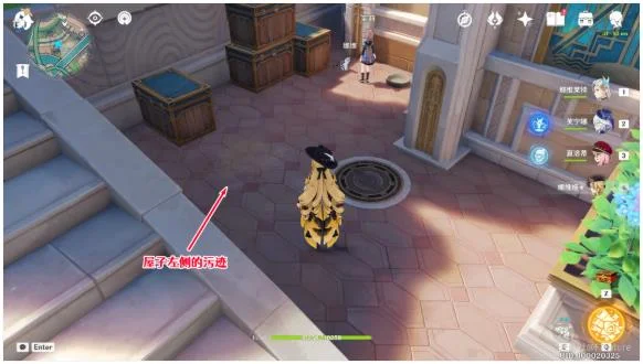 对话结束后,我们使用风元素或水元素攻击,清理小屋门口左右,以及小屋后面角落里的污迹即可。(白天污迹看不清楚的话,可以使用元素视野观察)
