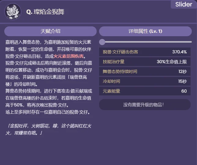 璨焰金猊舞的猊兽·文仔成功与嘉明会合时,将为嘉明恢复15%生命值。