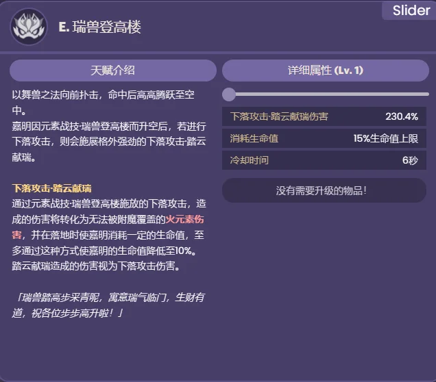 瑞兽登高楼的下落攻击·踏云献瑞命中敌人时,将为嘉明恢复2点元素能量。该效果每0.2秒至多触发一次。