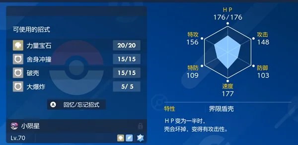野生小陨星技能:力量宝石,破壳,舍身冲撞,大爆炸