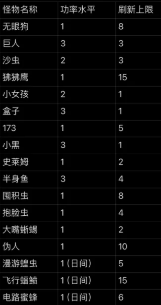 怪物的刷新遵从功率系统,不同怪物拥有不同功率水平,以及不同刷新上限(例如小黑上限1,当杀死后该地图不会再次刷新)其中飞行蝠赣、
