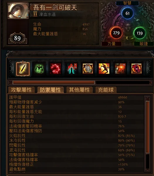 这是我的防御面板,接近5W的护甲,80的三抗,800+的秒回,,+50%双格挡和带幸运的76%法术压制
