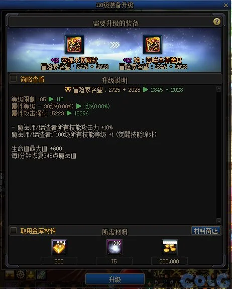 升级固定消耗300金绿、75稀薄迷雾和20万金币。