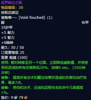 裁缝专业的高级玩家可以获得超界蛛丝之靴,这是一款适合法系DPS玩家使用的鞋子。如果你是元素萨和平衡德玩家,更推荐选择学习裁缝专业,因为布甲鞋看起来比皮甲手套更适合你们。