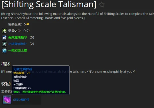 去棘齿城旅店找到NPC奈奥拉,她是一位专业对口的学者。用40个奇异之尘、5个强效魔法精华、2个小块微光碎片和5G将变幻之鳞制造成幻变之鳞的护符。
