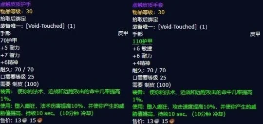 制皮玩家制作虚触皮质护手和虚空之触皮手套时,这种同时提高物理和法系命中的装备非常适合增强萨满,同时也很受绿甲坦克职业的欢迎。但唯一的问题是,法系版皮甲手的特效使用会增加仇恨,感觉有些奇怪。