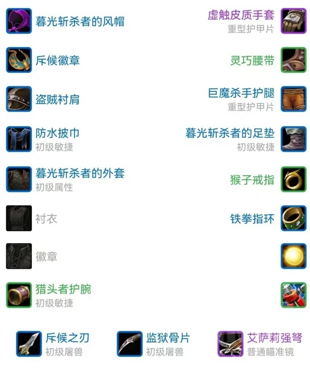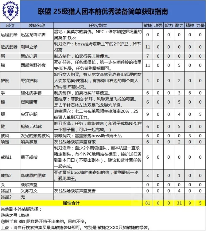 3. 联盟猎人 和上表的区别有:腰带换为深渊2的7敏腰。戒指2换为绿色敏捷之XXX或灰谷银翼声望戒指。