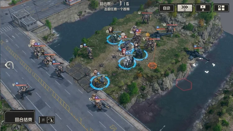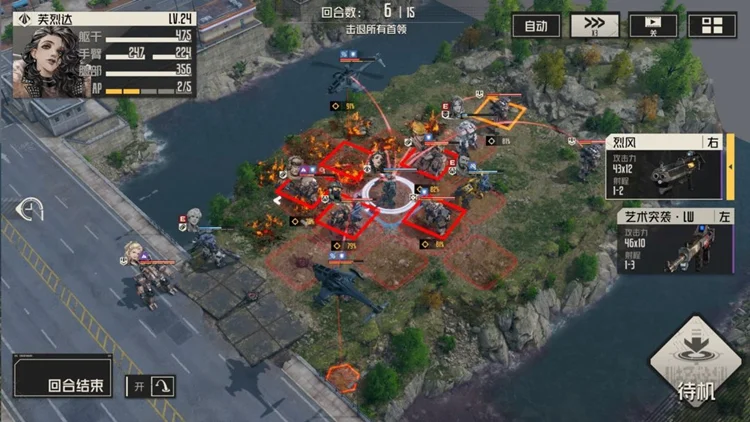 黛娜和芙烈达站位靠前,需要注意的是芙烈达必须携带一把机枪,以获得3射程攻击能力,第一回合就能攻击到boss,安娜站中间确保援护范围。