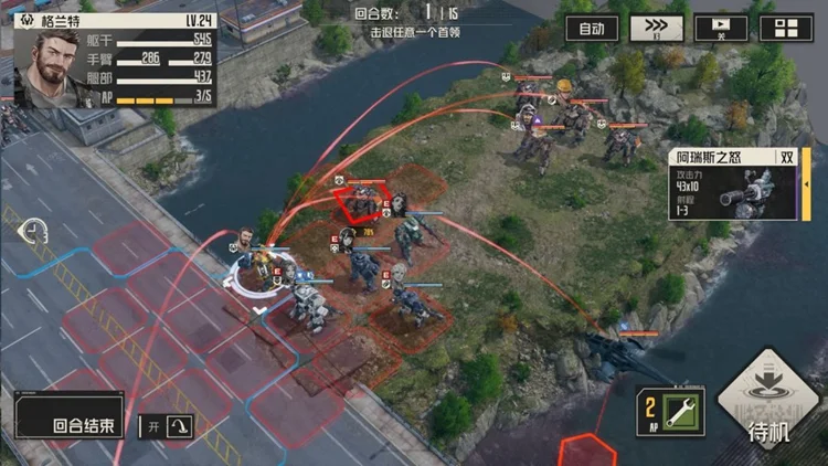对于这三个boss,我们攻击的第一优先级是中间的地雷boss,故此,开局应向中部突破,快速将地雷boss消灭;到第三回合时,电磁炮boss和长柄boss会来到中间时,此时根据预期,我们应该已经将地雷boss消灭,关于这两个boss,需要先消灭长柄boss,因为电磁炮有充能时间,不具有持久威胁,也没有携带其他武器,所以我们可以先消灭长柄boss